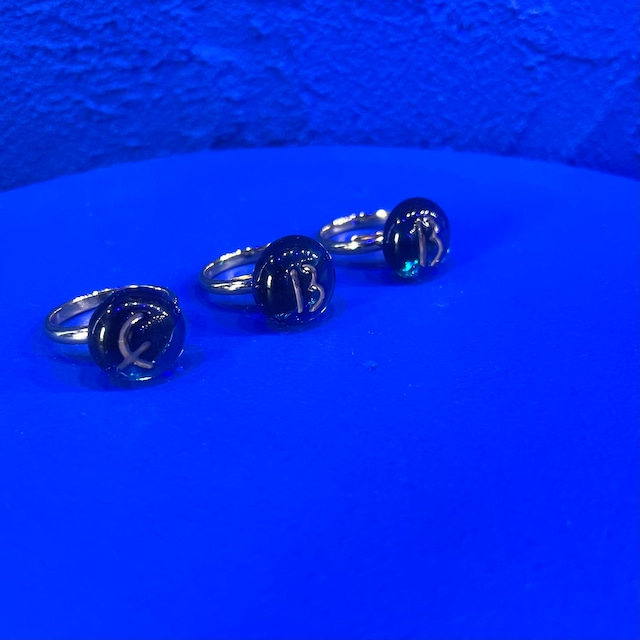 トキシル・ハさんの作る青〜緑〜紫のオーロラのようなオリジナルブルーのガラス作品にエバブルロゴのEを彫り込んだ作品です。 リングは11号〜13号となっています